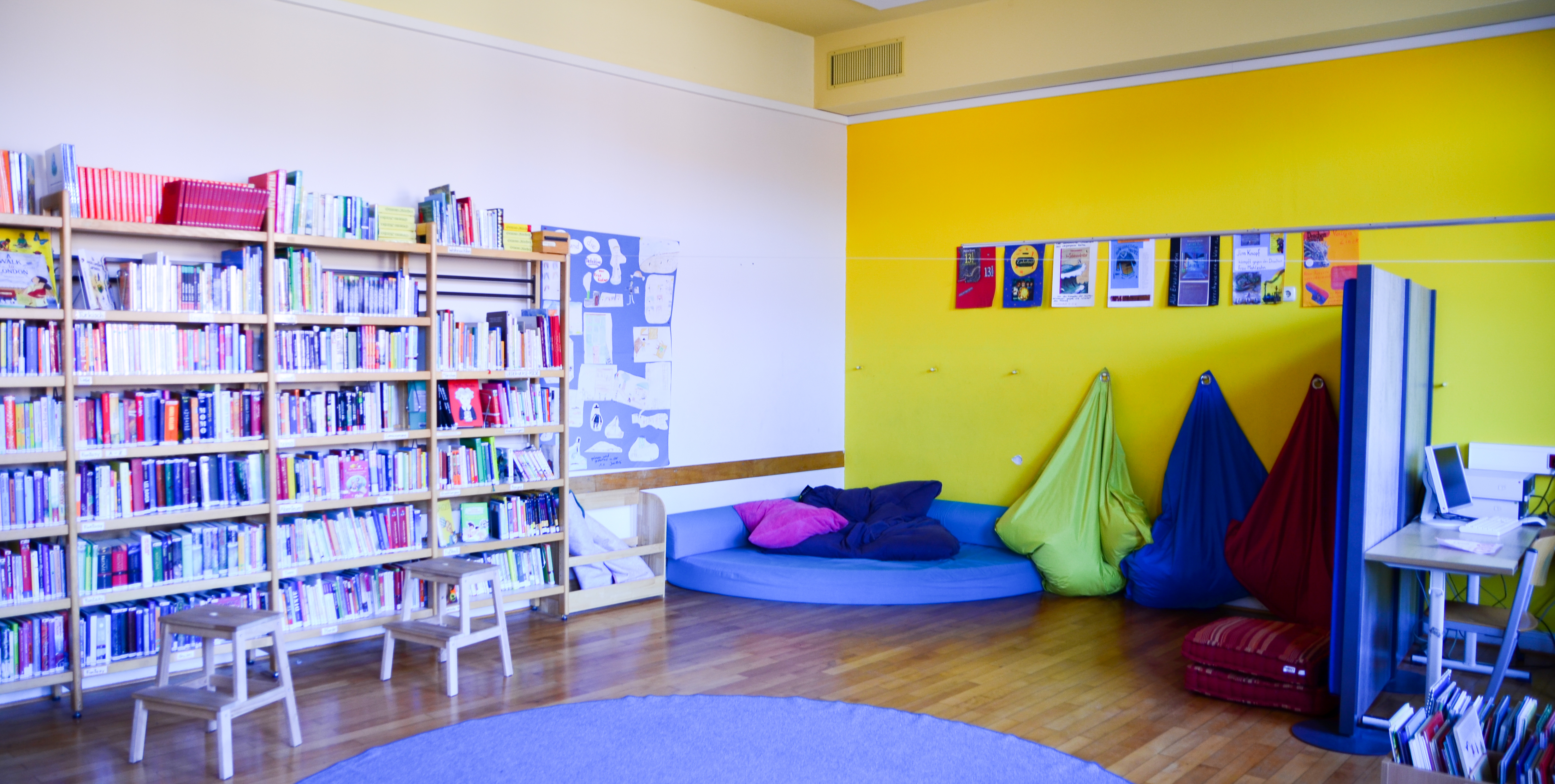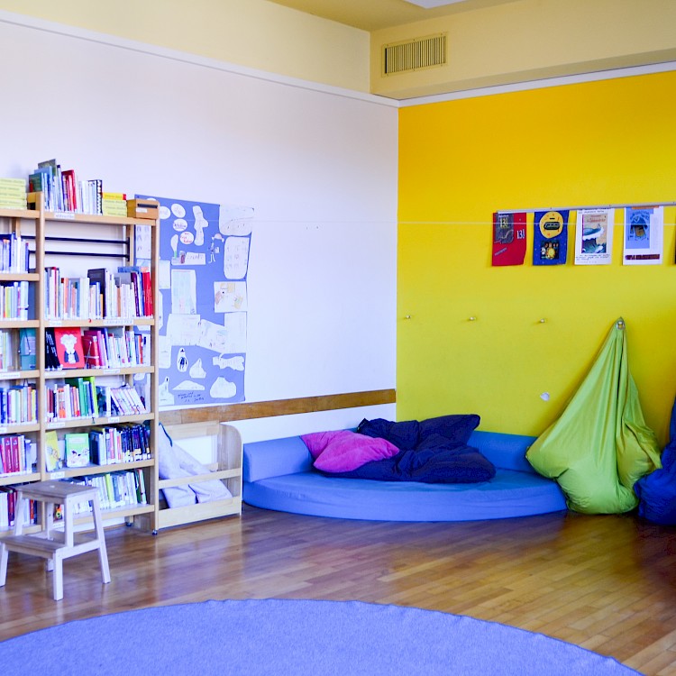 Im 2. Stock befindet sich unsere wunderschöne Bücherei. Durch viel Eigeninitiative und Mithilfe von Eltern konnten wir vor einigen Jahren einen Raum zur Schulbibliothek umgestalten. Es gibt eine große Auswahl von Büchern für jedes Alter und auch in verschiedenen Sprachen. Auch Bilderbücher für die Leseanfänger und Sachbücher sind dabei. Die Kinder dürfen sich dort Bücher ausleihen oder in der Bücherei lesen. Die Bibliothek ist in den Pausen geöffnet. Während der Unterrichtsstunden findet dort Leseförderung mit Lesepaten oder in Kleingruppen statt. Auch unser Lesehund Zorro unterstützt Kinder beim Lesen.