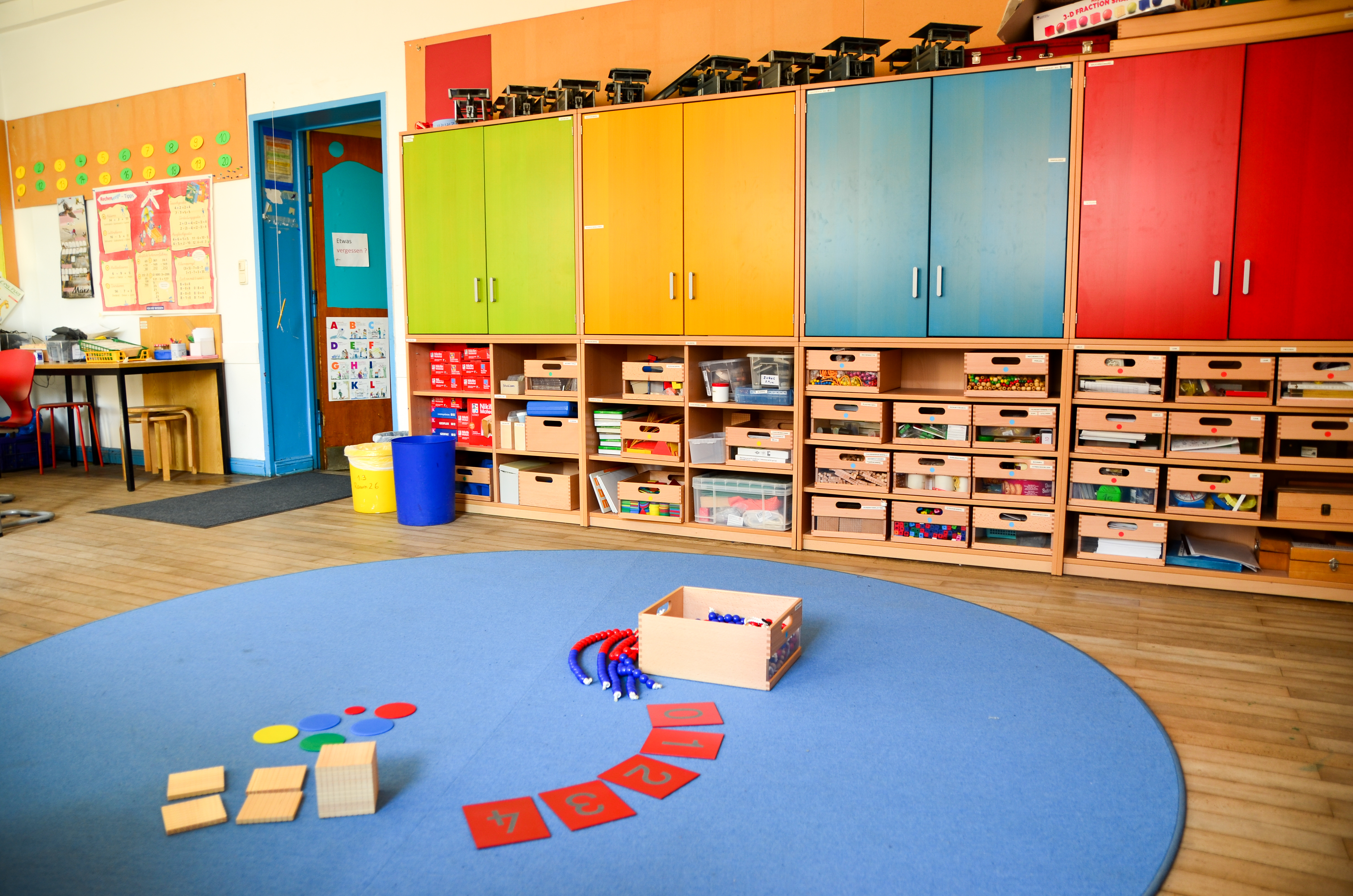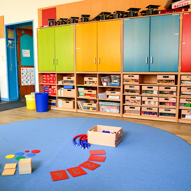 In der Mathewerkstatt im 2. Stock gibt es eine ganze Welt voller Mathematik. Der Raum lädt zum Forschen, Entdecken und Spielen ein. Für viele Themenbereiche der Mathematik gibt es Materialien und Spiele. Der Raum wird während der Unterrichtszeiten für den Mathematikunterricht genutzt.